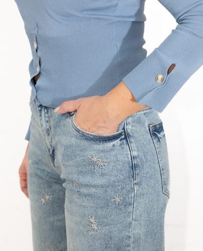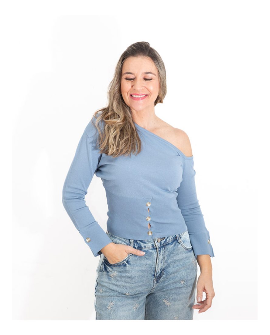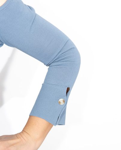 Cuenta con botones decorativos en la parte frontal a la altura de la cintura y también en los puños de las mangas.