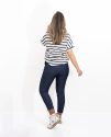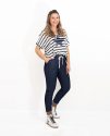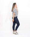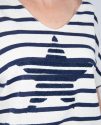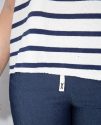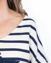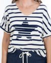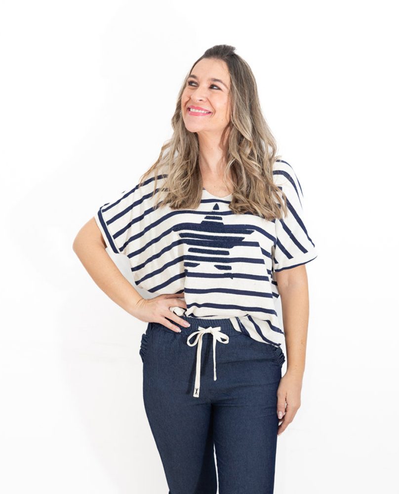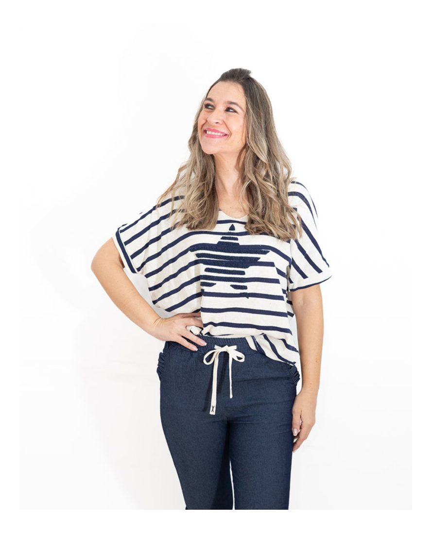 Presenta un diseño de rayas en azul marino que le aporta un estilo marinero atemporal, y en el centro destaca una estrella en el mismo tono azul marino, creando un detalle llamativo y armonioso.