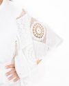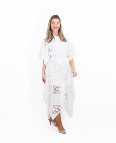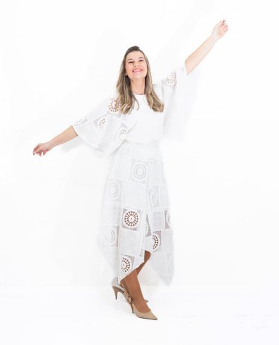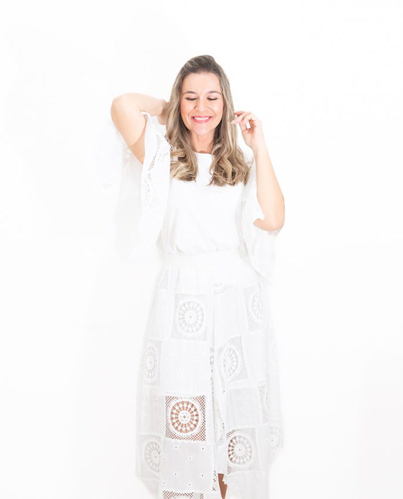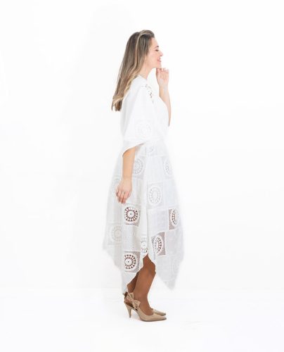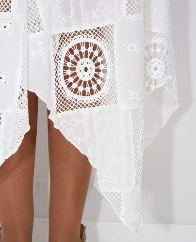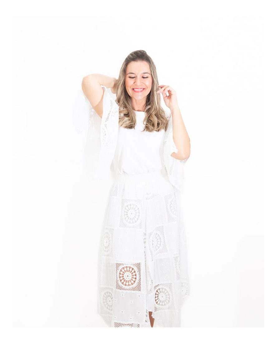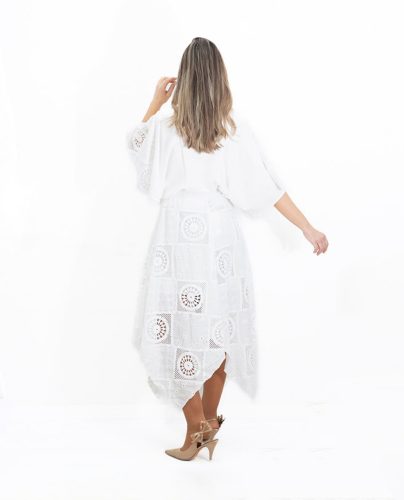 La falda es asimétrica y está confeccionada íntegramente en encaje blanco, aportando ese aire delicado y sofisticado que convierte el conjunto en una opción especial y muy femenina.