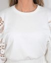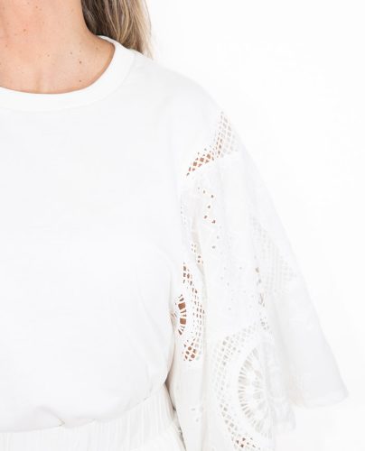 La camiseta combina a la perfección, con mangas en encaje, cortas y anchas que aportan volumen y protagonismo. El cuerpo es de algodón, que se adapta al cuerpo y equilibra la textura del encaje con un acabado más casual. Un conjunto versátil y con carácter, ideal para destacar con estilo propio.