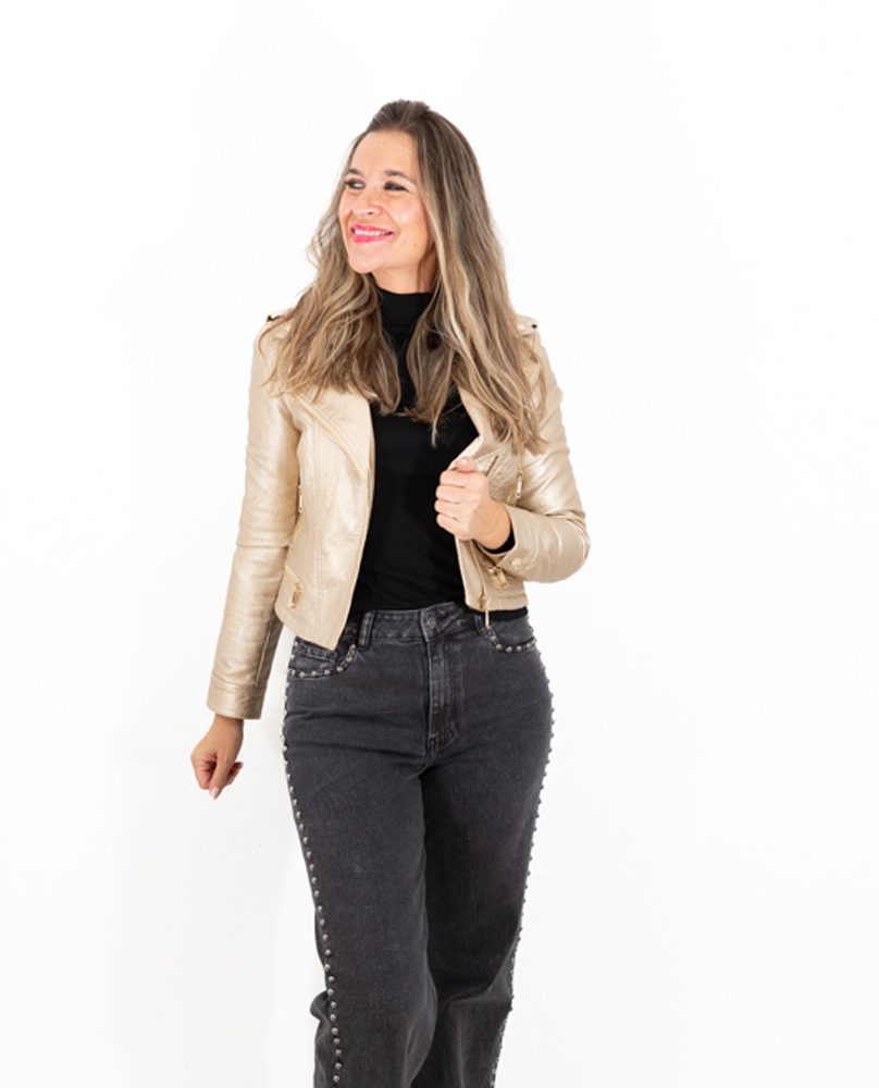 La ecopiel es blandita, muy agradable al tacto, y las cremalleras doradas le aportan un brillo precioso.