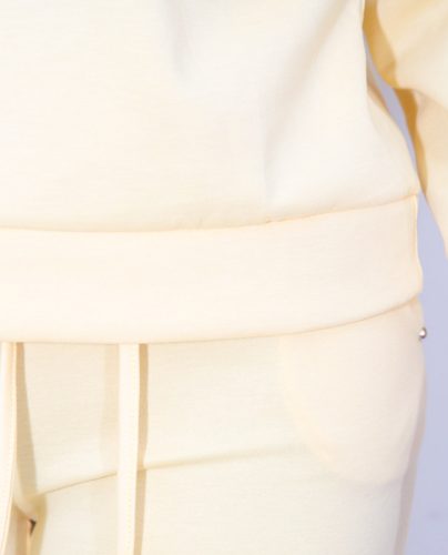 La sudadera tiene tachuelas doradas en la zona del cuello, que aporta un toque moderno y sofisticado, elevando un diseño clásico de chándal a un nivel más elegante y llamativo. El pantalón mantiene la armonía del conjunto y tiene tachuelas en la zona de los bolsillos, creando un sutil contraste.