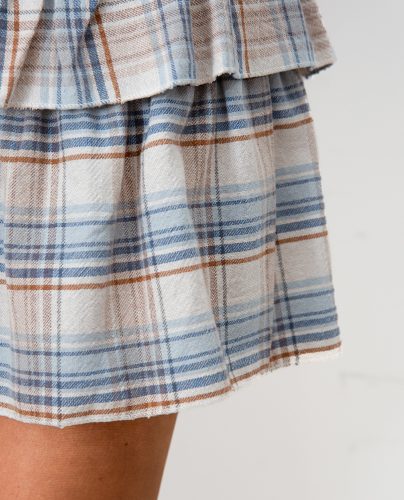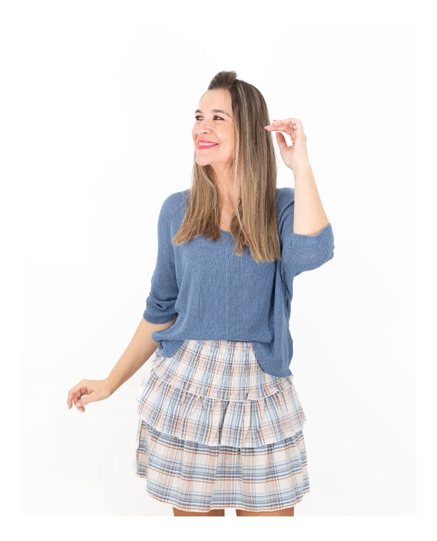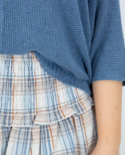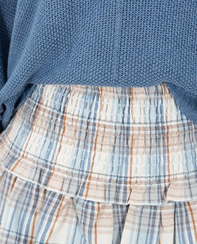 Falda Panama, en talla única que abarca 36-42 aproximadamente , engomada en la cintura y con un estampado a cuadros en los tonos azules, marrones y beige súper bonitos y primaverales.