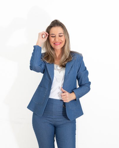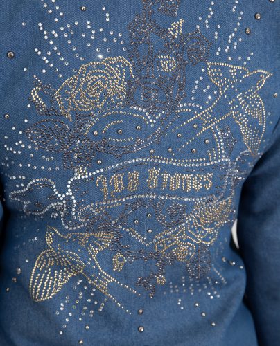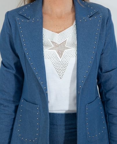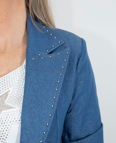 Chaqueta Stone Denim, chaqueta tipo americana en denim azul que presenta tachuelas en el borde de las solapas y de los bolsillos, mientras que la espalda destaca por su diseño en tachuelas plata y doradas que dibujan pájaros y rosas junto al nombre de la marca.