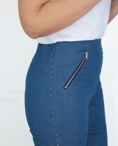 Pantalon Stone Denim, pantalón denim campana de cintura alta, incorpora dos cremalleras decorativas en los laterales que simulan bolsillos y una línea de tachuelas plateadas en el lateral de cada pierna.